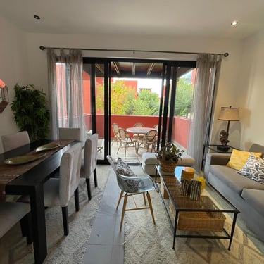 Sala – Comedor, Cocina Integral, Terraza, 1 Recámara principal con vestidor, 1 Recámara secundaria, 2 Baños completos, Lavandería.